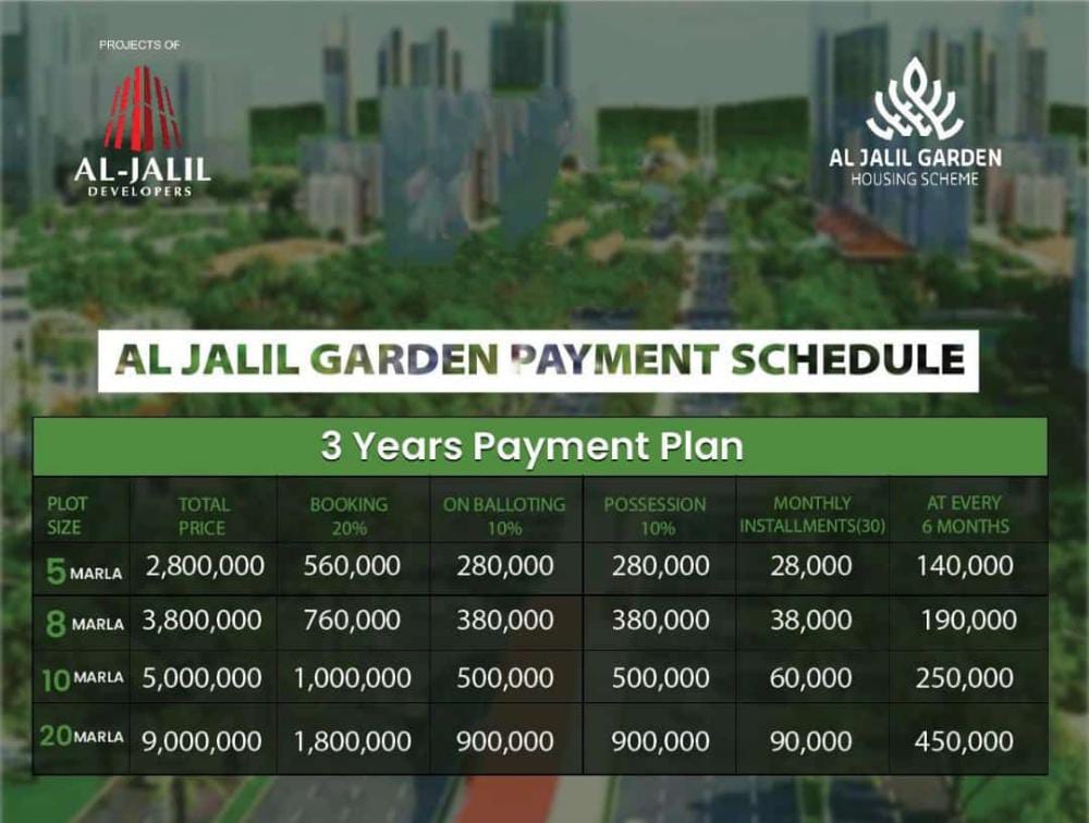 Our highlighted project, Al Jalil Garden Housing Scheme, offers commercial and residential 03, 05, 08 and 10 marla plots in Lahore. It also is the main project of Al-Jalil Developers. This splendid project comes with all the necessary and top-quality living facilities with a whole 3 years flexible payment plan.